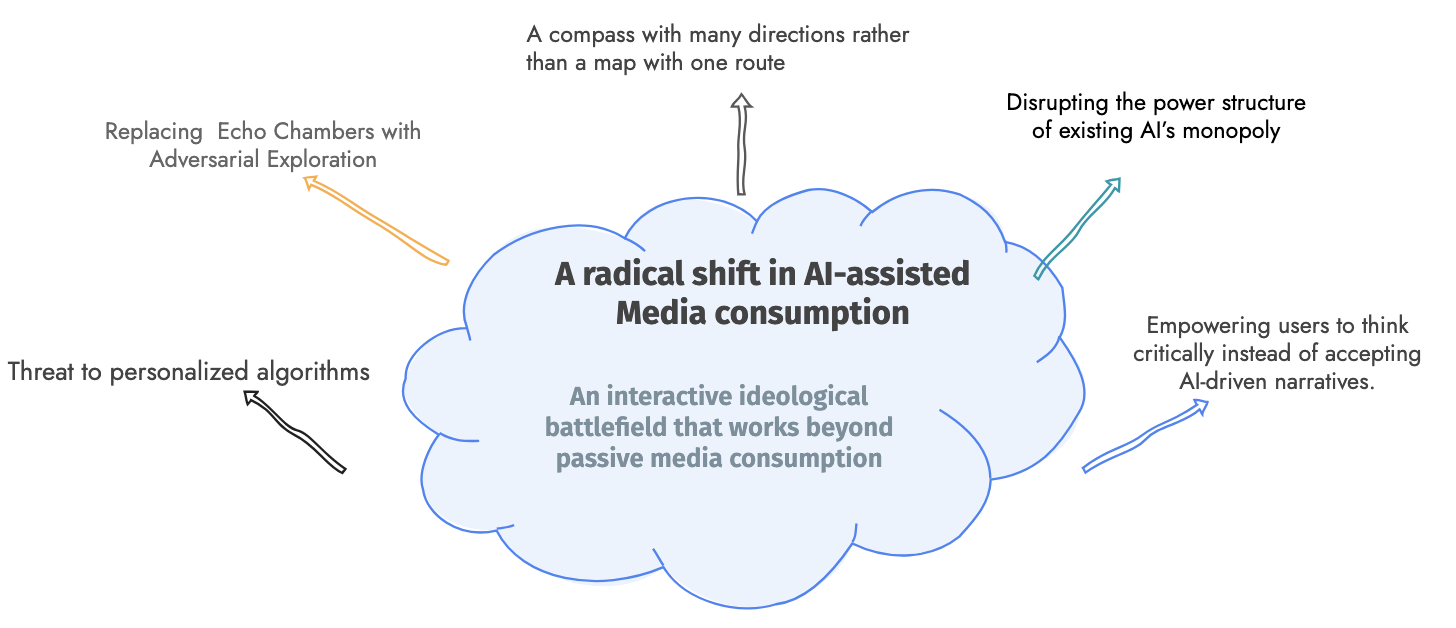 e-Agora draws inspiration from Ancient Athens, where decision-making centered on public assemblies where opposing speakers would debate issues. This tool fights single-viewpoint content consumption and breaks through echo chambers by showing users multiple perspectives on exactly what they're reading or thinking about, structured as live debates.