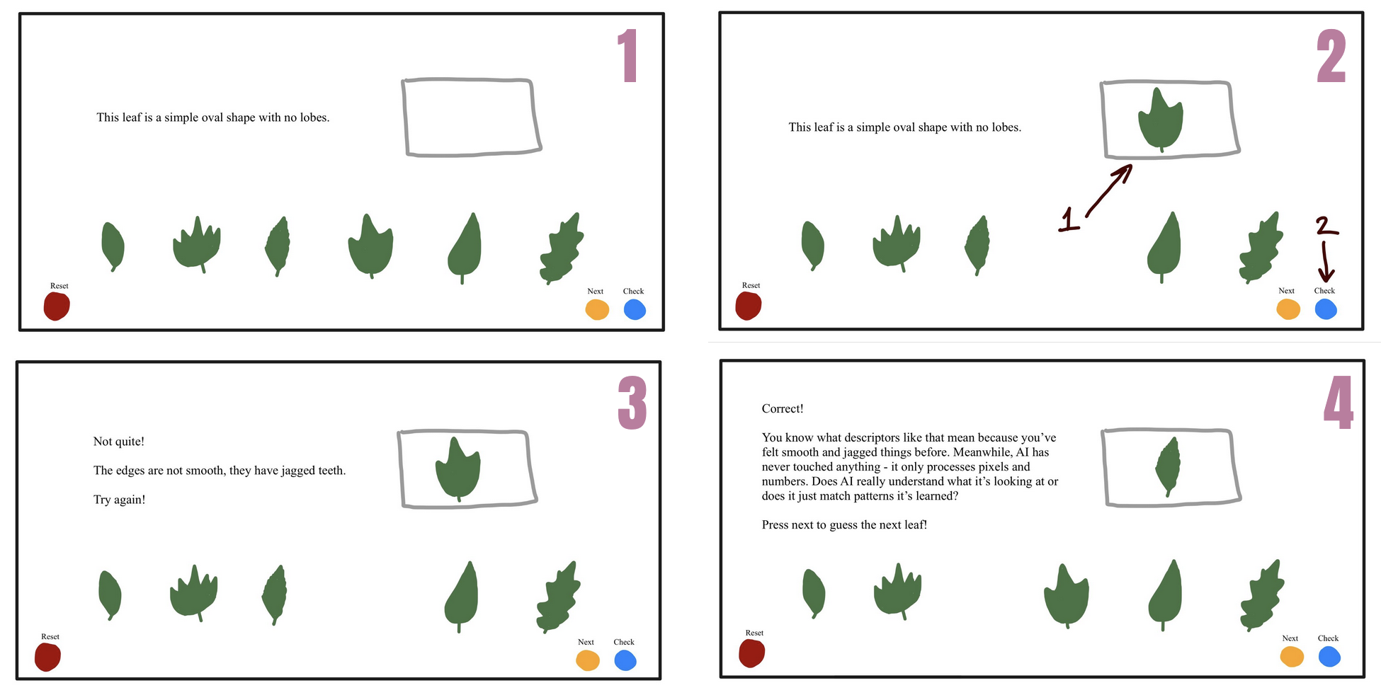 We started our ideation process using leaves as an unbiased and widely understood object. The user would be presented with 6 similar but still different objects, the system would give a very vague prompt, and the user would have to make a guess as to which object it’s referring to. If the user is right, it moves onto the next general prompt. If they are not, the system gives a slightly more specific prompt.