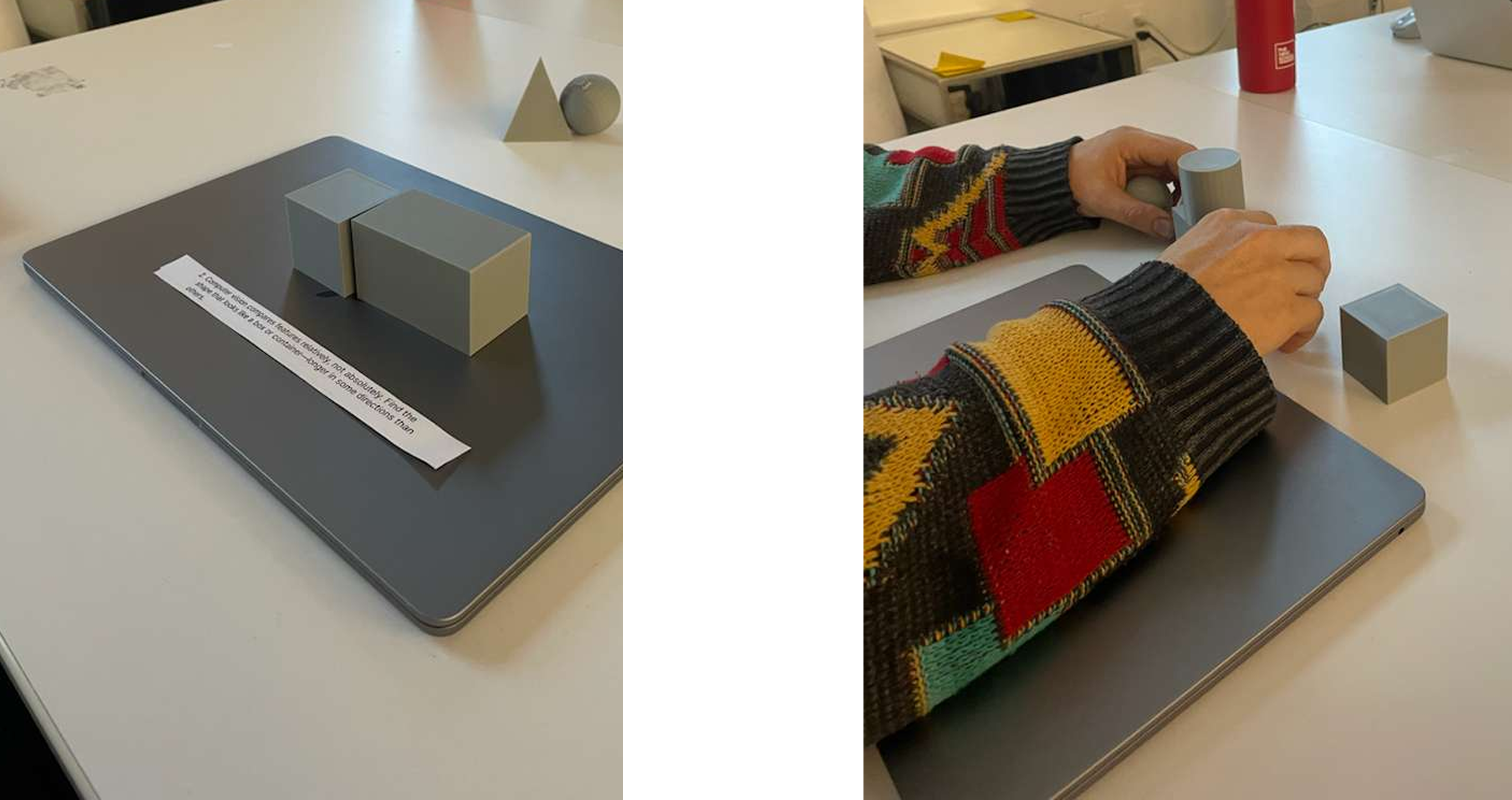 We used simple shapes to perform our playtesting with five participants. Participants were instructed to read the prompt and place their object of choice on top of the Apple computer’s logo. Most of them placed possible shapes on the side as a visual aid to help them narrow down their options. Everyone was able to guess the objects during the first two attempts. We discovered that we need to have clear instructions for removing previous objects and that participants fidgeted with blocks like Legos, so we need to make the final 3D print durable.