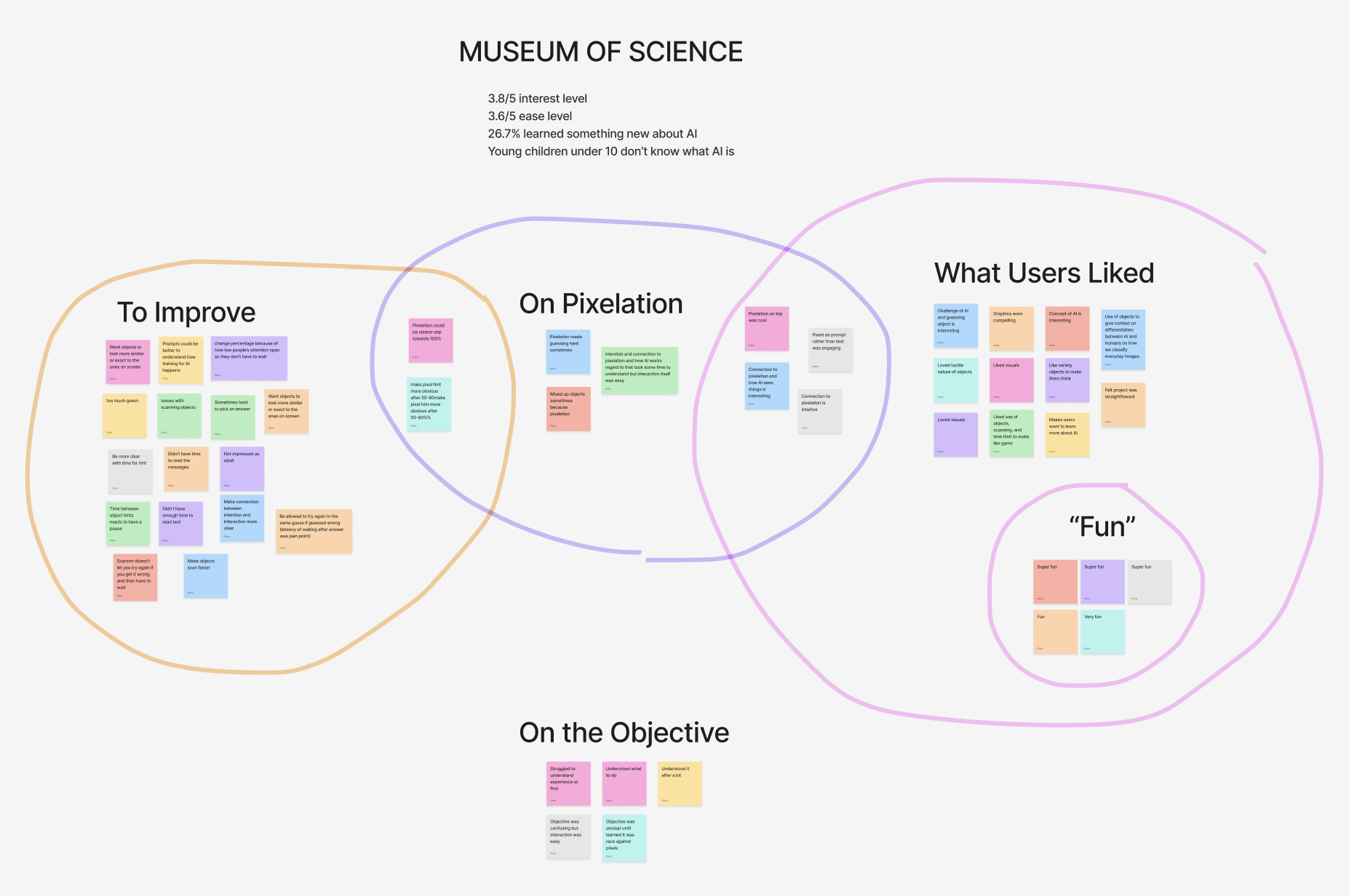 Users overall enjoyed the experience. The visual prompts rather than written prompts should be maintained as they are engaging and resonate with users. The level of pixelation also hits our goal of “productive struggle”, as users couldn’t immediately figure out what the object was (only 2/9 comments on pixelation viewed it as detrimental to the project).